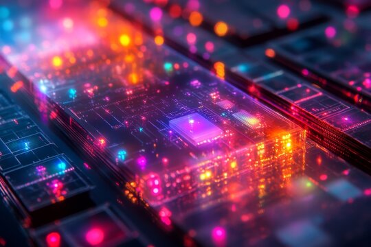 Close-up of a circuit board with a central processor, illuminated by vibrant neon lights