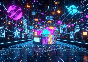 Neon shopping cart in a futuristic digital space with planets and screens.