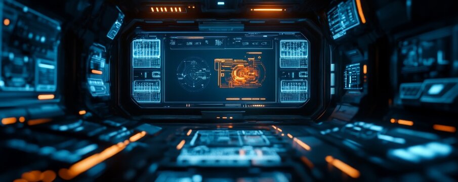 Futuristic Sci-Fi Spacecraft Interior with Glowing Orange and Blue Lights