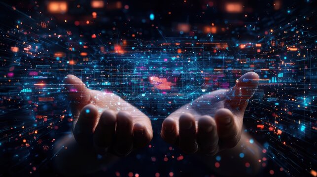 Hands holding a glowing digital interface with holographic data and futuristic technology elements in a dark, tech-inspired environment, virtual AI hologram