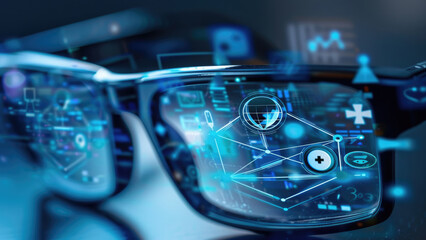 Glasses with a digital interface and holographic displays. Technological elements and data are displayed on the lenses, creating a futuristic look.