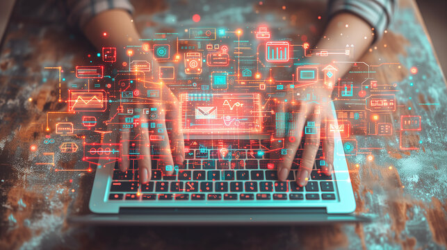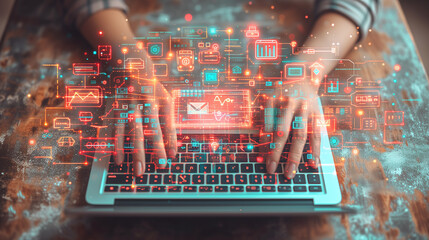 Close up of a person s hands typing on a laptop with a futuristic holographic interface displaying ai and technology icons representing digital innovation and artificial intelligence