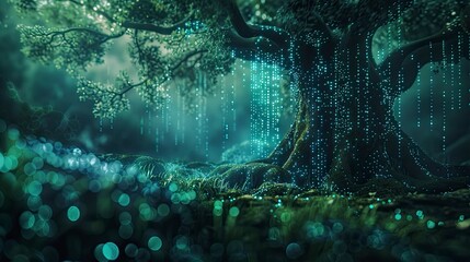 A creative concept showing code integrated into nature, like code lines forming the branches of a tree, symbolizing the harmony between technology and the environment.