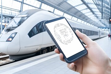 Hand holding a smartphone with a QR code for a digital train ticket at a modern railway station, symbolizing smart travel, technology, and seamless public transportation