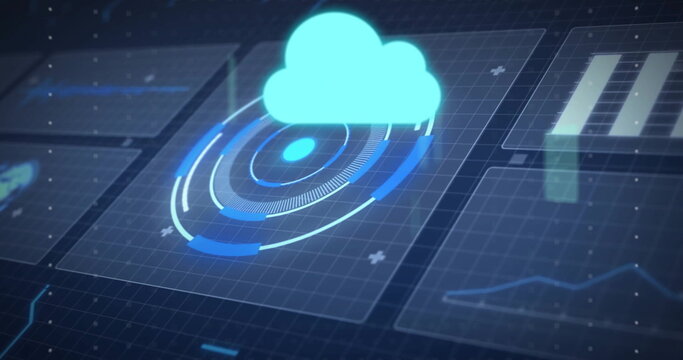 Cyan cloud icon floating above radar on dark grid, showing bar charts line graphs plus symbols