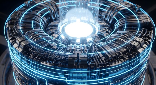 Futuristic tokamak fusion reactor with glowing blue plasma energy