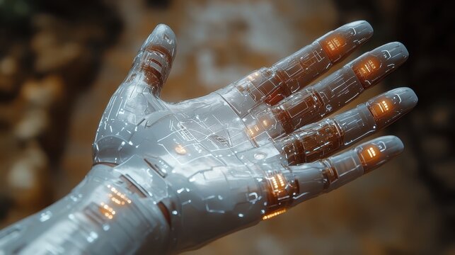 Futuristic robot with articulated fingers, interacting with a digital object in a bright, minimal space. Artificial Intelligence, Futuristic Digital Technology, Metaverse of Digital Intelligent World
