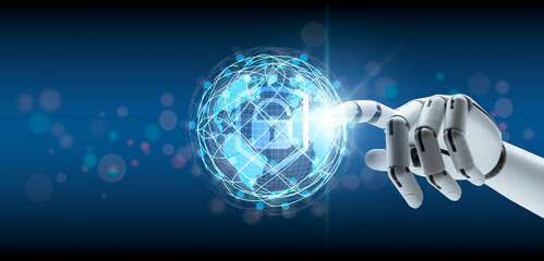 Manager or Industrial engineer working and control robotic with industry factory and network connection automation robot arm by tablet. AI, Artificial intelligence.