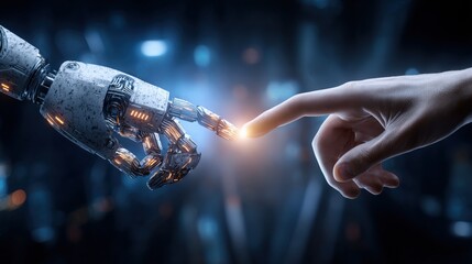 Human and robot hands touching. Future technology and artificial intelligence concept. Connection between digital cyborg android life and man person.