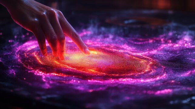 a glowing fingerprint scanner interface as a user authenticates their identity copy space, focus on trust futuristic, overlay in a sleek modern environment