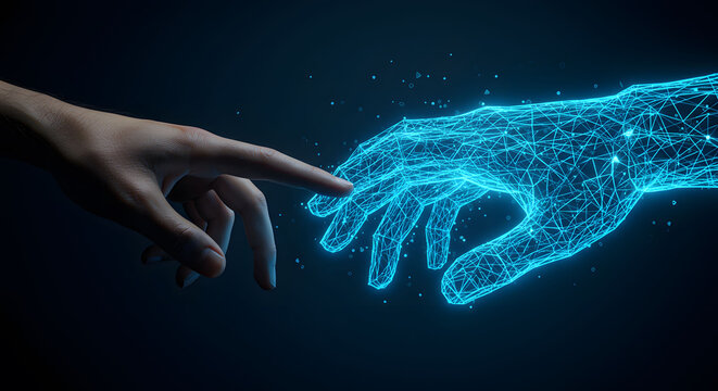 Human and robot hand touching a futuristic holographic screen for digital interface interaction