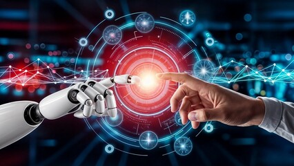 robot and human hands touching, artificial intelligence science and technology, innovation and futuristic.