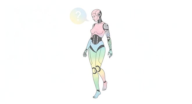 Stylized depiction of an ambiguous, gradient-colored female humanoid robot pondering something.