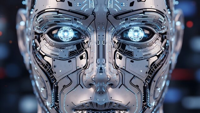 Stunning close-up of a futuristic AI robot face with glowing blue eyes, showcasing advanced technology and a metallic, intricate design