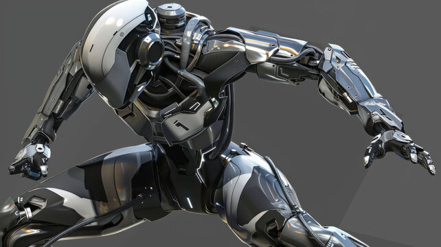 A sleek futuristic robot is captured in a dynamic pose, showcasing its shiny metallic exterior and advanced mechanics against a neutral background.
