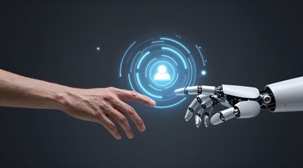 Conceptual image of a robotic arm and a human hand touching, surrounded by futuristic digital graphics, symbolizing AI and human collaboration.