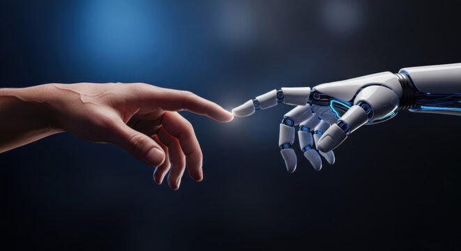 Close up of a human hand gently touching a robot's hand against a dark background, illuminated by a soft blue light, symbolizing technology and future interaction.