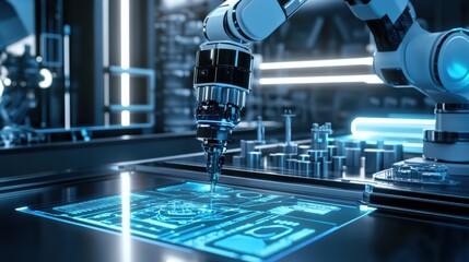 Robot arm interacting with holographic interface in futuristic lab