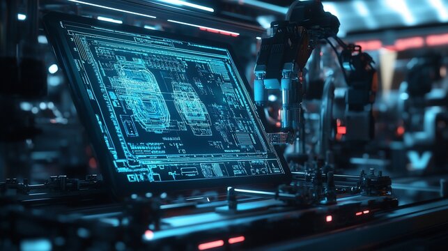 A close-up of a futuristic computer screen displaying a technical blueprint, with a robotic arm in the background.