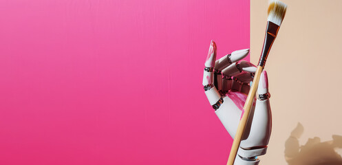 A robot hand holds a brush with flowing paint on a colored background with copy space. AI concept replaced artists