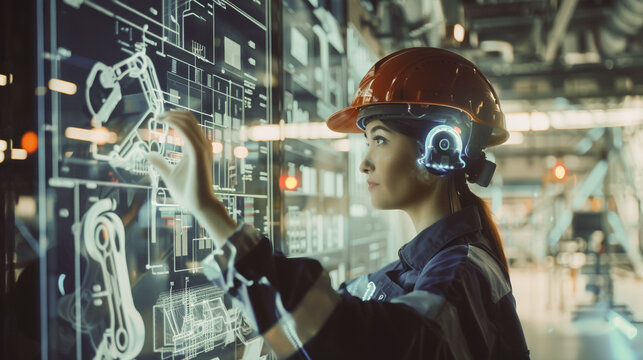 A beautiful female engineer is designing the workings of a mechanical arm in an industrial factory.