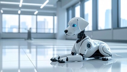 A futuristic robot dog, embodies innovation and the potential of artificial intelligence. sitting inside modern interior, the sleek design and technological sophistication.