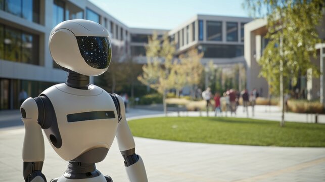 A futuristic university campus with humanoid robots assisting students and professors, Academic support style, photo of