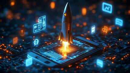Innovative Mobile Technology with Rocket Launch Symbolizing Digital Growth : Generative AI