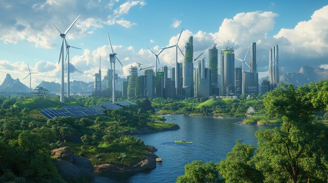 A scenic view of a green city with wind turbines and solar panels, showcasing sustainable energy sources and modern urban development.
