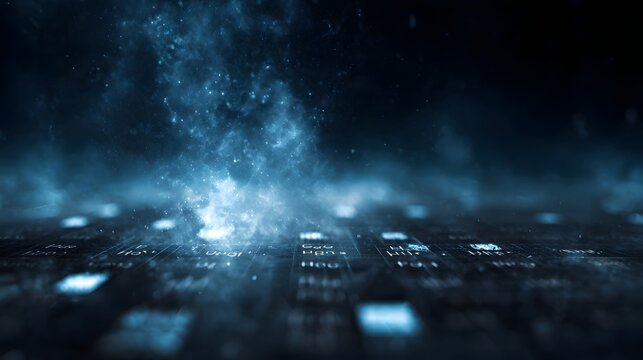 Futuristic blue digital hologram displaying scientific elements against a dark ethereal background