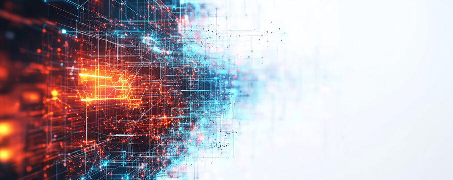 A high-tech digital data transfer concept with vibrant lights and depth showcasing network abilities, technological processes, digital storages, and scientific advancements in a blurred bright tone ba