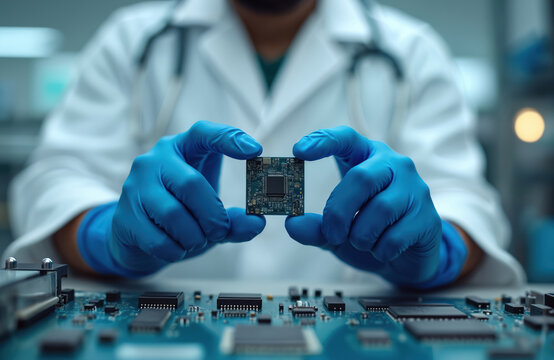 Close-Up View of a Microchip on a Sterile White Workstation, Highlighting Technology and Precision Engineering