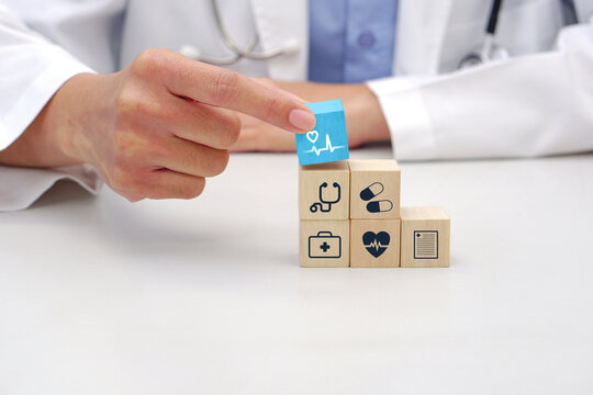 Hand holding a wooden block cube the top one with word and icon symbol. Medical and health concept.