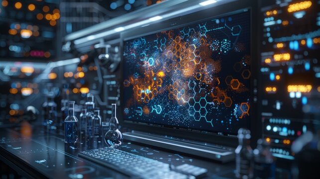A futuristic laboratory workstation with a computer displaying a data visualization of hexagonal patterns, showcasing scientific research and innovation.