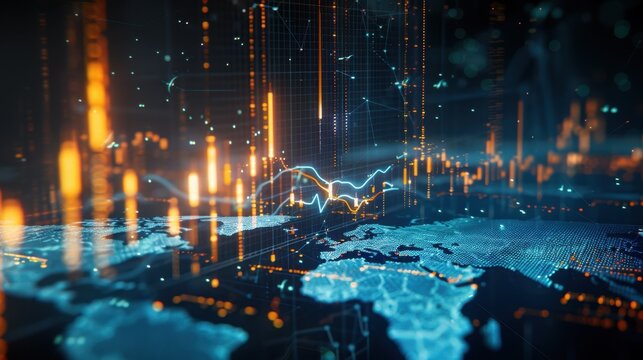 A futuristic digital interface displays holographic data and analytics, showcasing advanced technology and scientific information.
