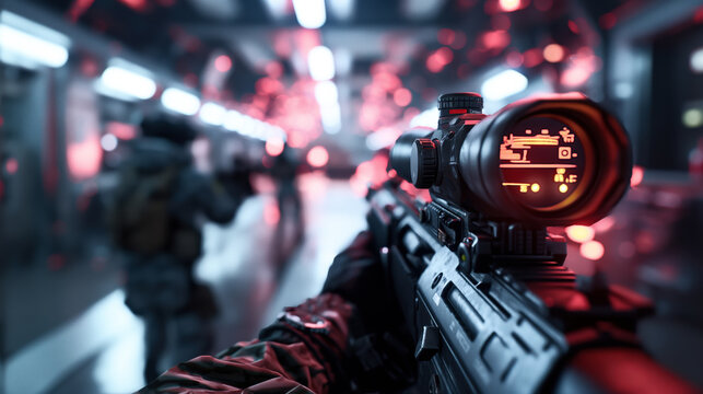 Close-up view of a futuristic rifle's scope with digital display in a red-lit setting, featuring blurred figures in tactical gear in the background.