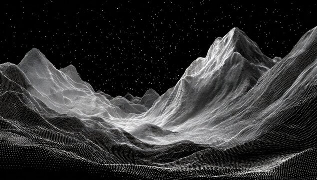 Abstract digital landscape.  Blue particles and lines form a wavy terrain on a dark background.  Particles range from fine dots to larger clusters,  creating a sense of depth