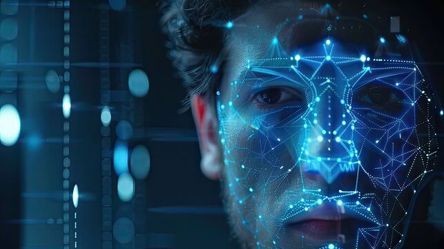 A young woman with a futuristic facial recognition grid superimposed over her face, staring directly at the camera.