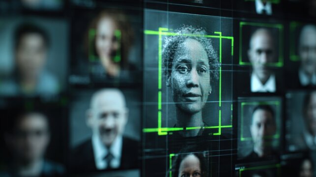 Surveillance System: A close-up of a face among many, highlighting digital scanning technology in action, embodying security