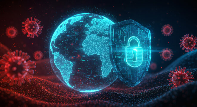 Digital illustration of a glowing shield with a padlock icon protecting a holographic Earth from a widespread virus attack, symbolizing global security and pandemic defense