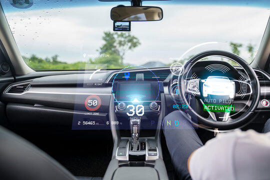 HUD Head Up Display and digital instruments panel autonomous car auto pilot self driving user interface navigation driving utility screen smart technology, businessman sleeping resting cruise mode