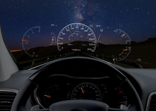 car equipped with a HUD display driving at night along a mountain road near a volcano