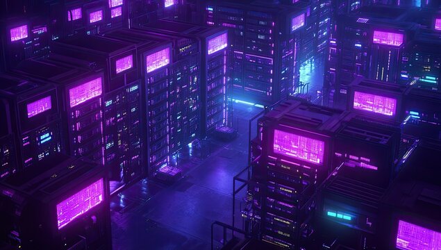Futuristic server farm bathed in vibrant neon lights.  A dense network of interconnected server racks, glowing with pulsating purple and blue light, creating an otherworldly, high-tech environment