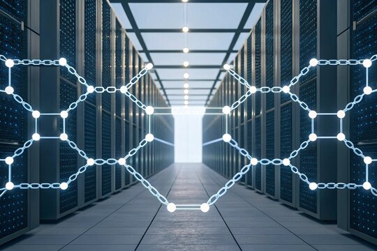 Futuristic Data Center Network Connections and Server Racks with Digital Network Overlay