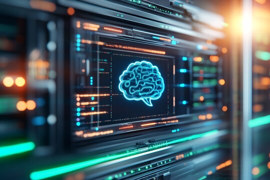 A futuristic AI chatbot interface is displayed on a digital screen with a blue brain icon and a sleek server room in the background. Green data streams run through the wires behind it.