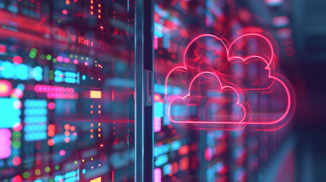 Futuristic server room displays modern digital tech. Cloud tech icon glows in data center. Modern tech equipment. Hybrid cloud network. Serverless architecture. Advanced computer system. Powerful