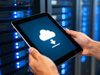 A server room with LED lights and a transparent cloud icon superimposed, indicating cloud storage solutions, cloud computing concept, blurred background, with copy space