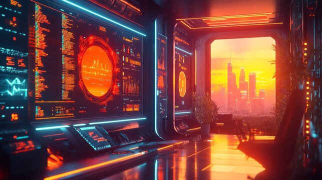 Futuristic, high-tech, illuminated command center