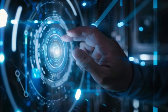 Hand interacting with a futuristic cybersecurity digital interface on a tech backdrop