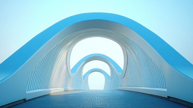Abstract futuristic white bridge with arched openings leading to a bright blue sky.